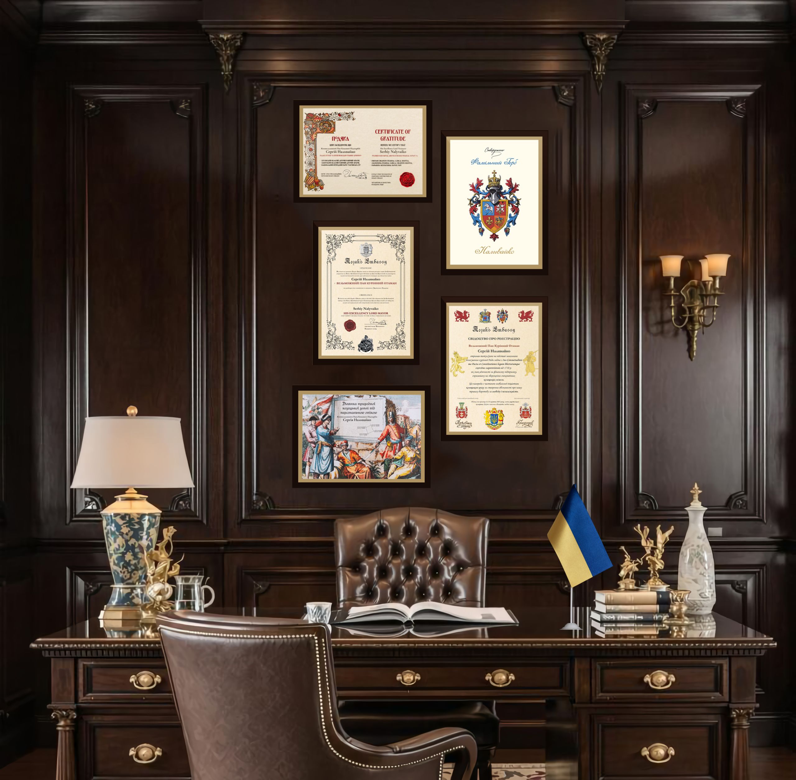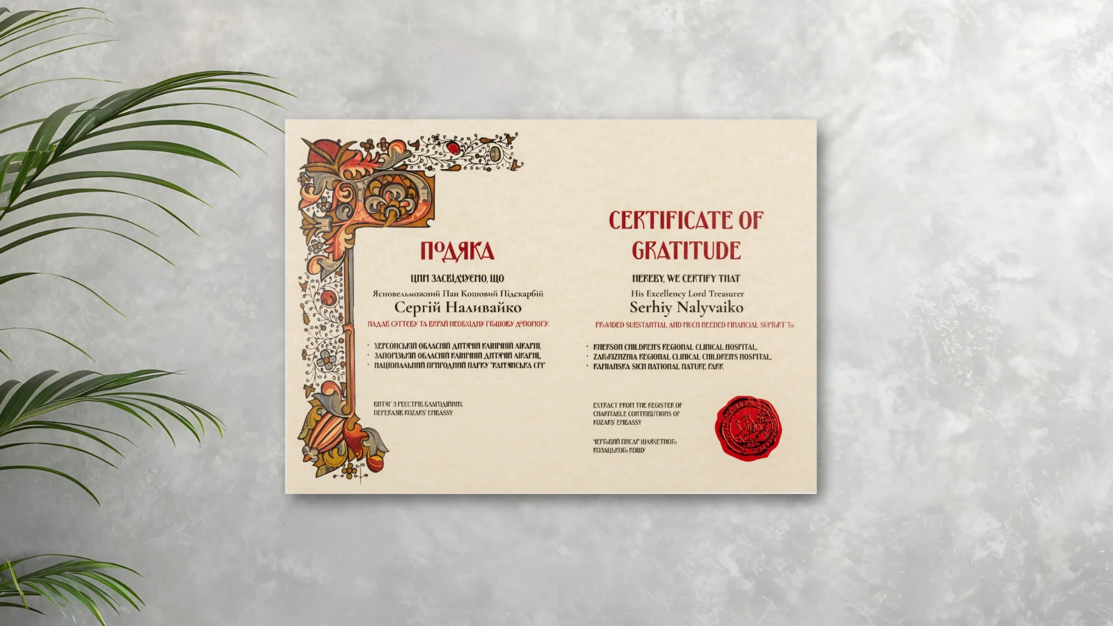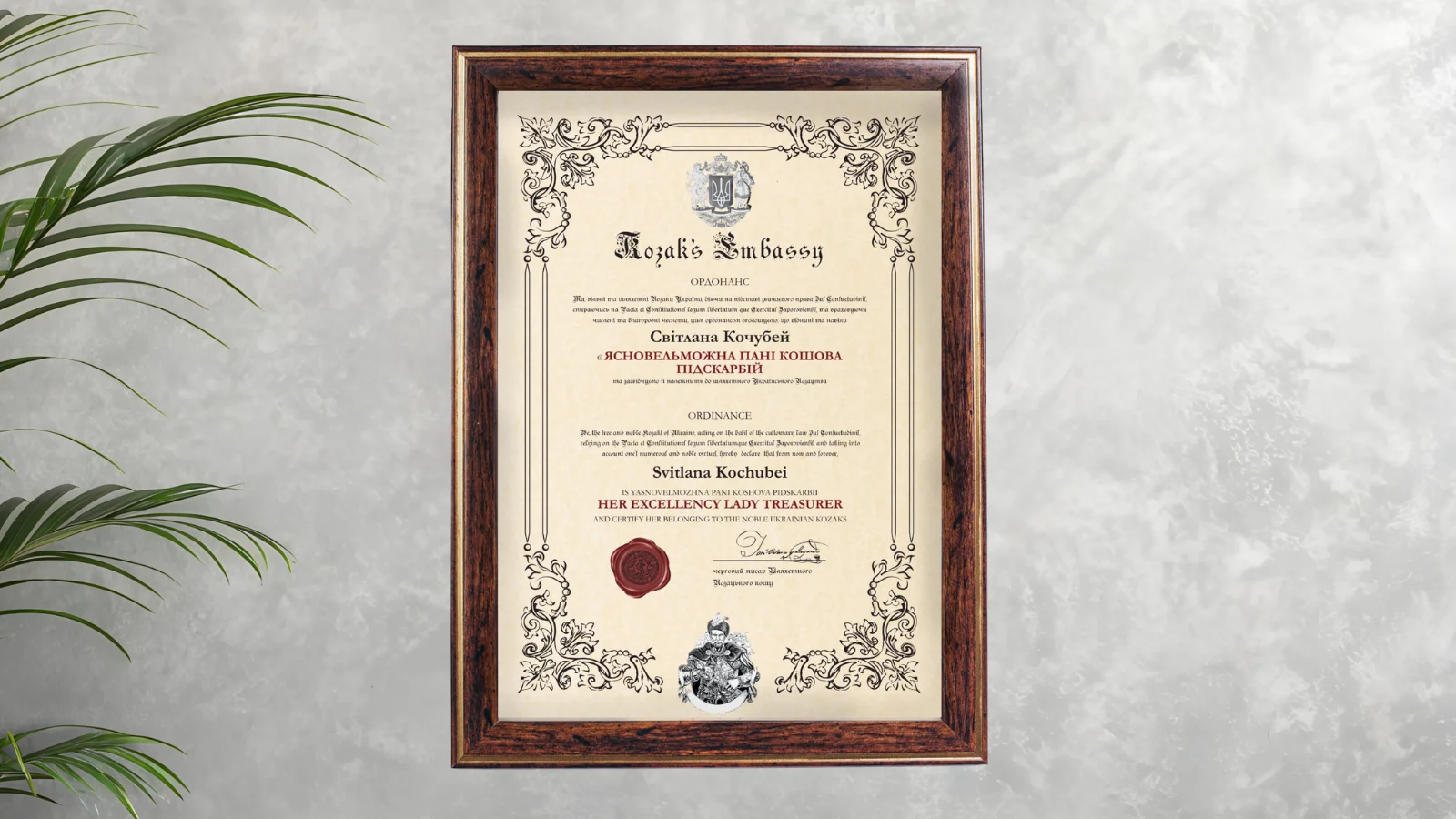 Yasnovelmozhna Pani Koshova Pidskarbii (Her Excellency Lady Treasurer) is an honorary title derived from one of the highest offices of the Kozak state, responsible for the treasury, revenues, and public prosperity.